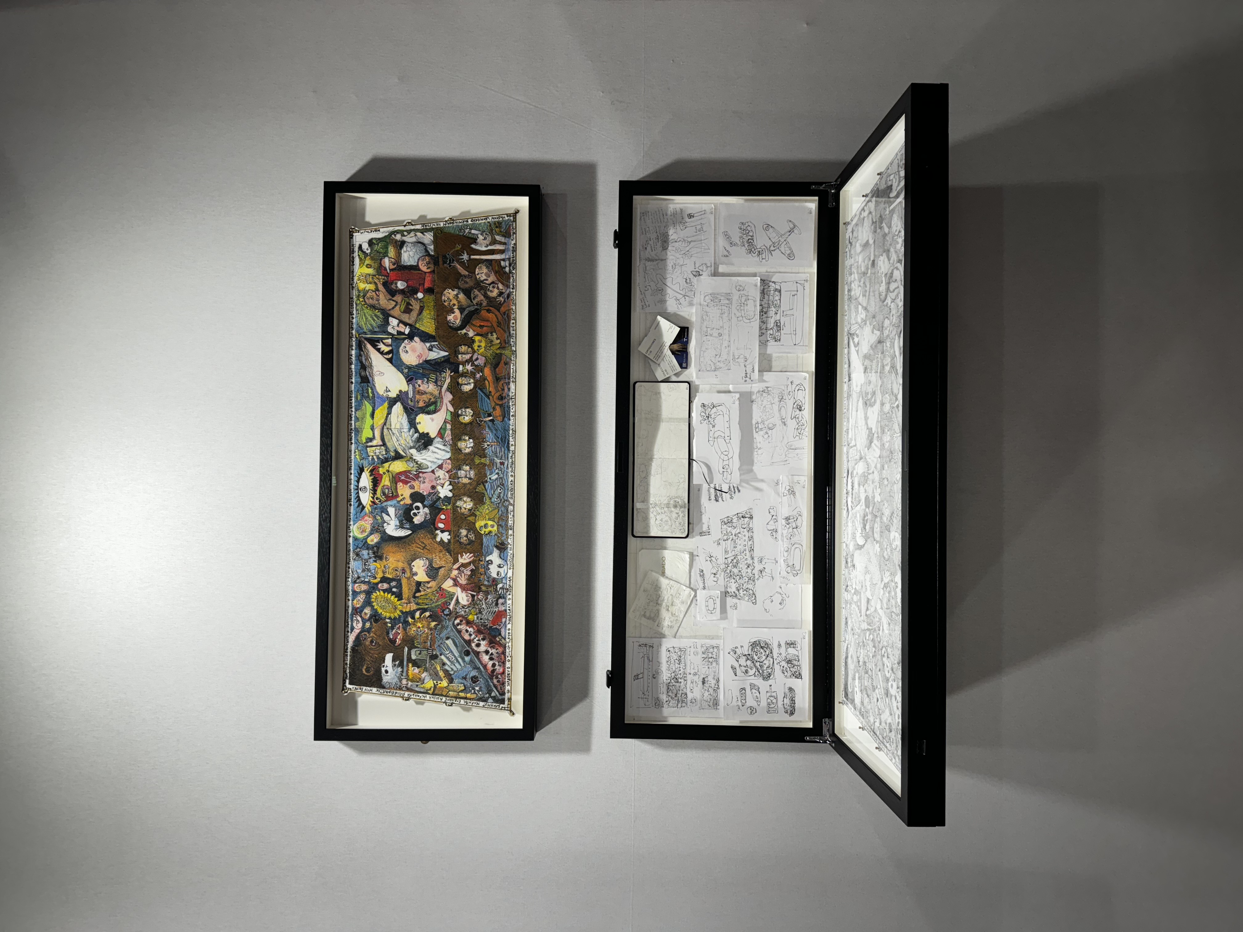 I wanted to keep the sketches and ideas together in a portable display that would typically accompany the Kinship drawing on exhibition. The triptych cabinet has a black-and-white print on the front face. Inside, it holds the original working scale drawing in pencil, along with a collection of sketches, a sketchbook, and tickets from my adventure in Madrid.